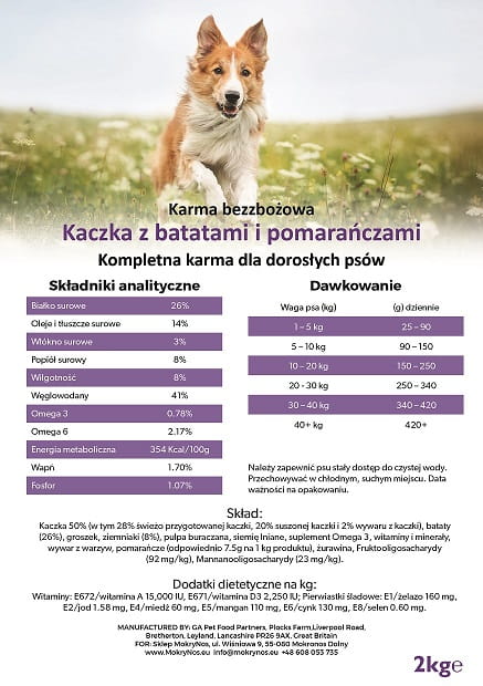 Skład: Kaczka 50% (w tym 28% świeżo przygotowanej kaczki, 20% suszonej kaczki, 2% wywaru z kaczki), bataty (26%), groszek, ziemniaki (8%), pulpa buraczana, siemię lniane, suplement Omega 3, witaminy i minerały, wywar z warzyw, pomarańcze (7,5 g na 1 kg), żurawina, frukto-oligosacharydy (92 mg/kg), manno-oligosacharydy (23 mg/kg).